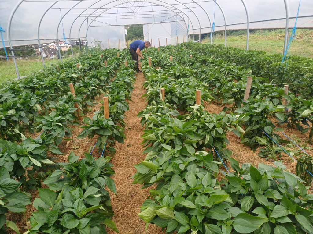 Das Hofteam hat außerdem im Paprikahaus Pfosten eingeschlagen, dann dazwischen Schnüre gespannt um so die Pflanzen zu stützen und sie vor dem umknicken durch ihr Eigengewicht zu schützen.