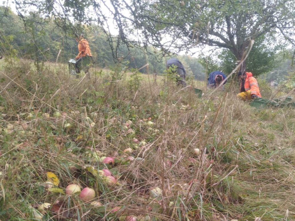 Mit uns auf der Wiese waren neben unseren derzeit 2 Praktikanten insgesamt 4 Solawimitglieder und sammelten mit vollem Einsatz fleißig mit uns Äpfel auf.