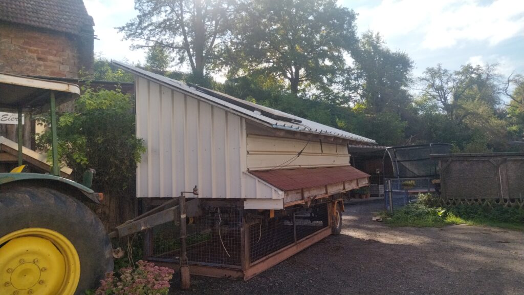 Bevor die 105 Hennen und 1 Hahn einziehen, führten wir bereits an dem Mobilstall noch einige Reparaturen durch, zudem wurde der Innenraum gesäubert und desinfiziert. Dafür fuhren wir ihn am Montag zurück auf den Hof. Noch ein paar Handgriffe, dann ist er fertig.