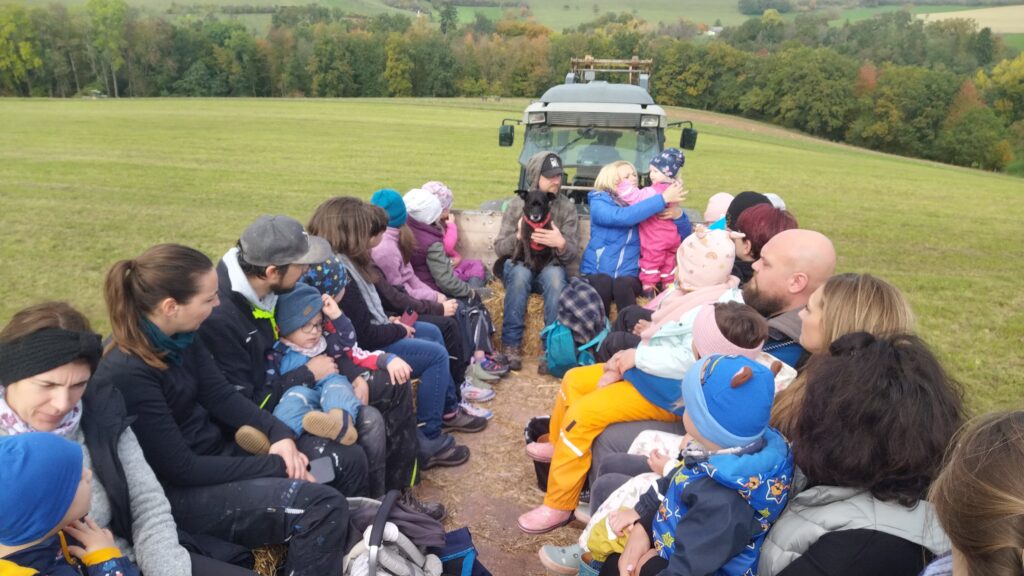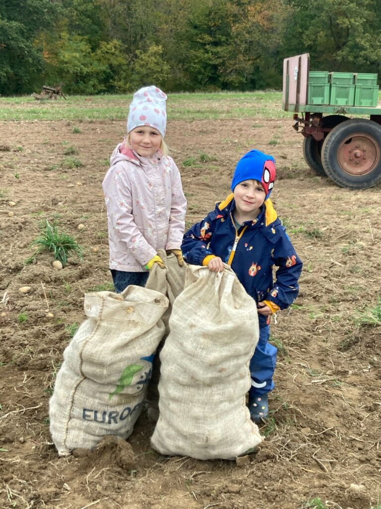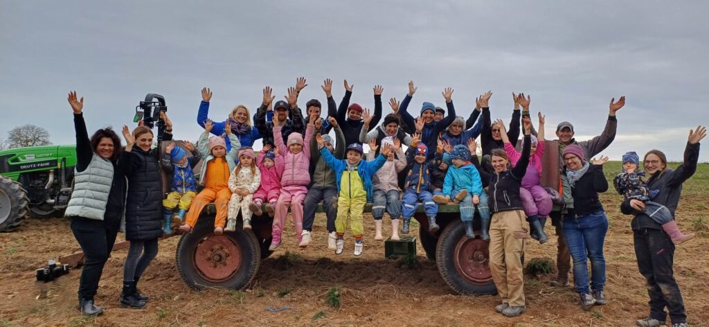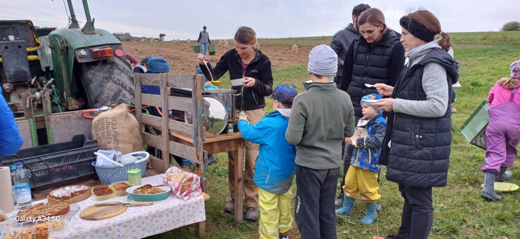 Mit dem Traktor fuhren wir gemeinsam zum Acker, dort erzählten wir ein bisschen über die wertvollen Knollen und was beim sortieren zu beachten ist, dann ging es ans sammeln.