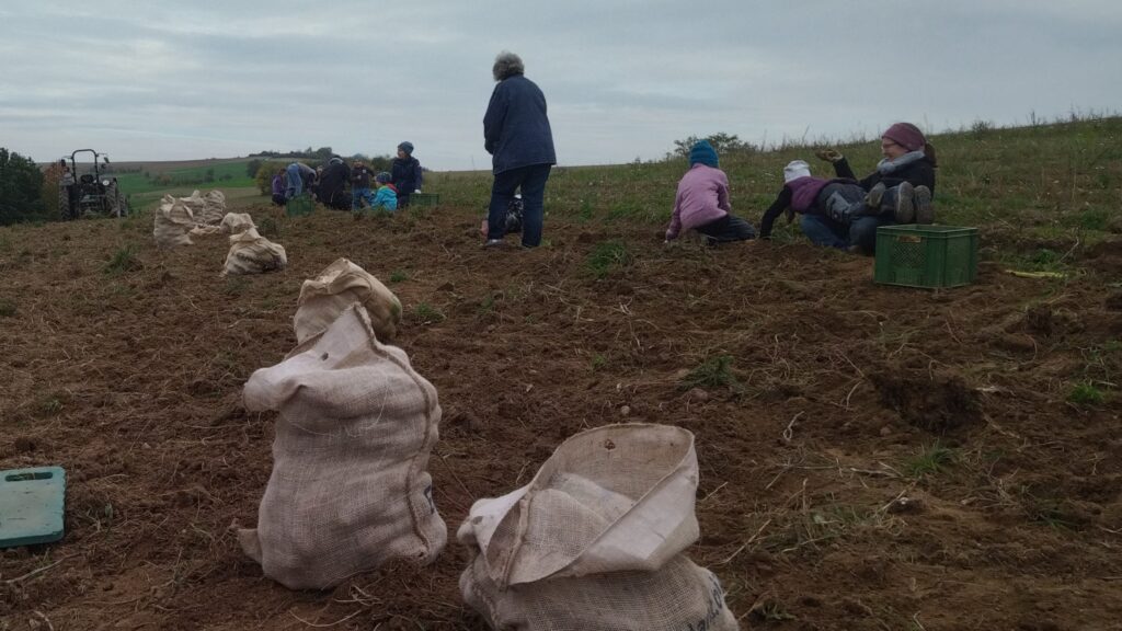 in diesem Jahr fühlt sich die Kartoffelernte endlos an, als befände sie sich in einer Dauerschleife. Warum dies so ist hat zum einen damit zutun dass wir ein ertragreiches Kartoffeljahr haben, was natürlich super ist,- jedoch verspätete sich die Ernte ohnehin schon, zudem mussten die Kartoffeln auf dem Acker sorgfältig sortiert werden. Letzteres hing mit den vielen Regenphasen der vergangenen Wochen zusammen, wodurch die Arbeit noch Zeitintensiver war. Doch würden wir bereits schlechte Kartoffeln einlagern, bestände die Gefahr dass gesunde Kartoffeln schneller angesteckt werden. Natürlich lässt sich dies nie komplett ausschließen.