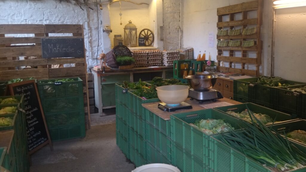 Tür des Abholraums alleine manchmal schwierig zu schließen mit voller Gemüsekiste. Ggf. Abstellmöglichkeit draußen oder selbstschließende Tür. Der Abholraum könnte etwas besser beleuchtet sein.
