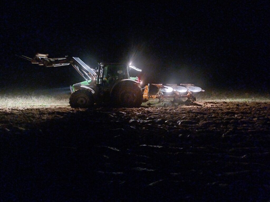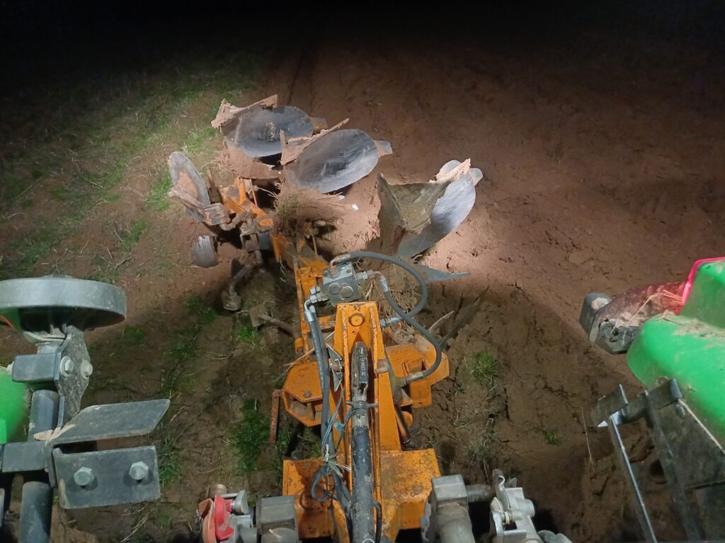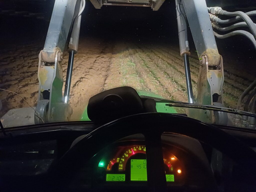 Bei noch frostigen Temperaturen hat Michael zu späten Abendstunden die Äcker sowie einen Teil der Gemüseanbauflächen gepflügt, somit den Boden aufgelockert und gewendet.