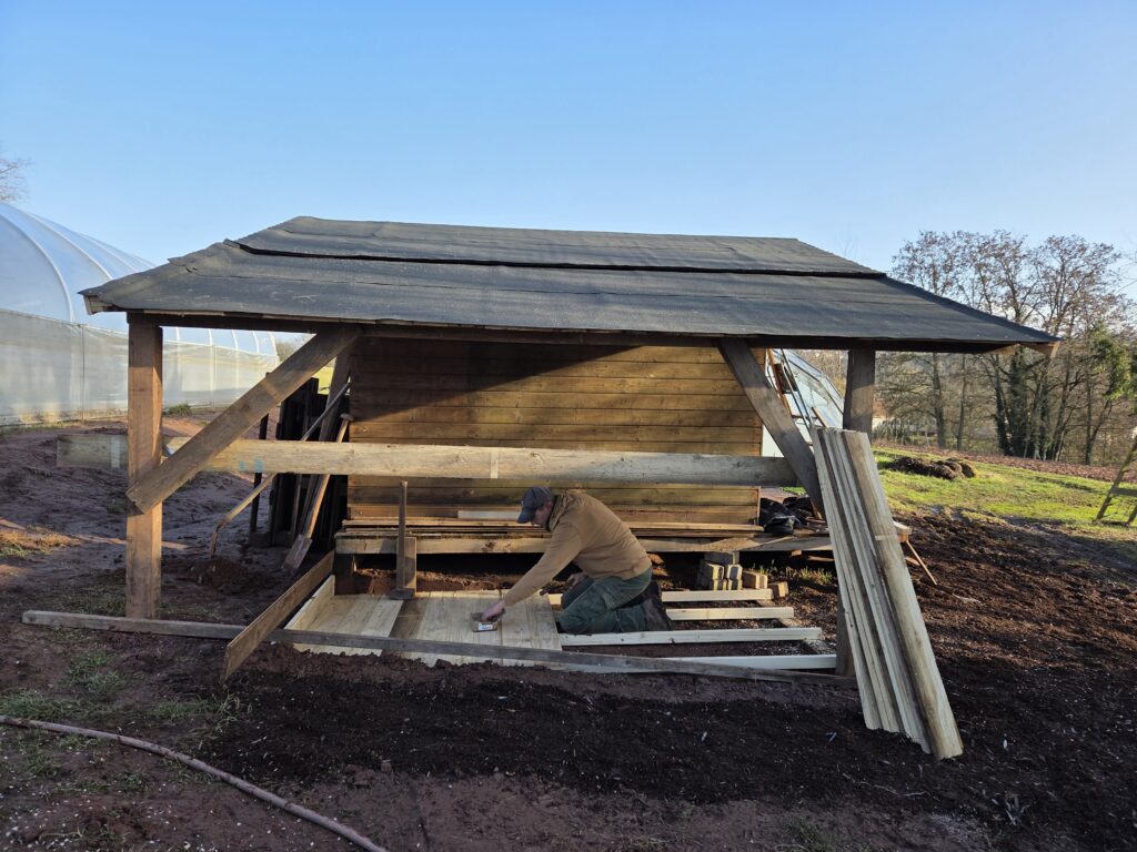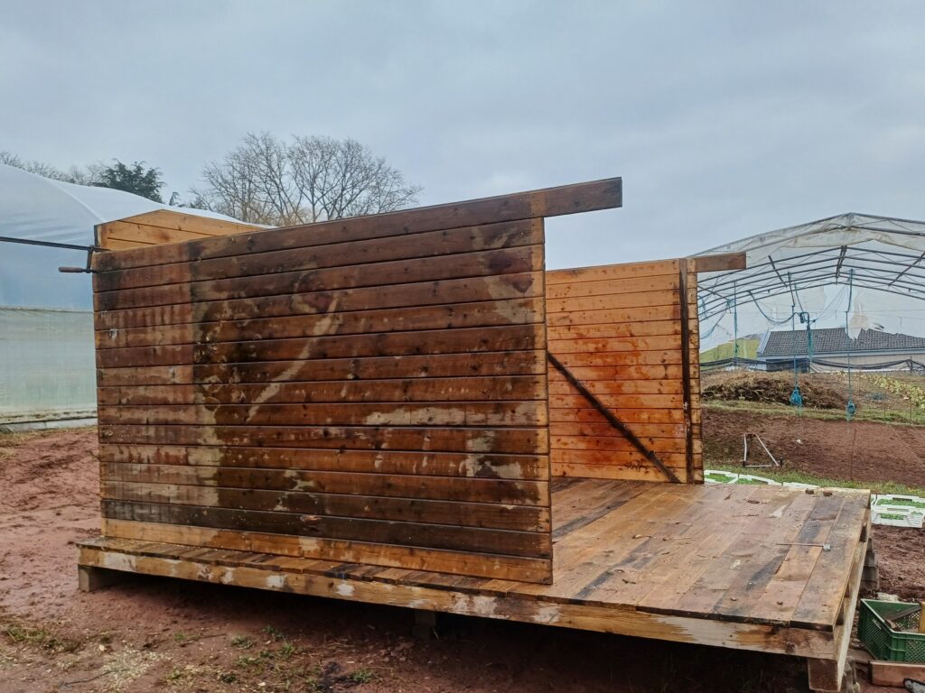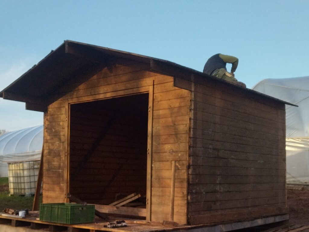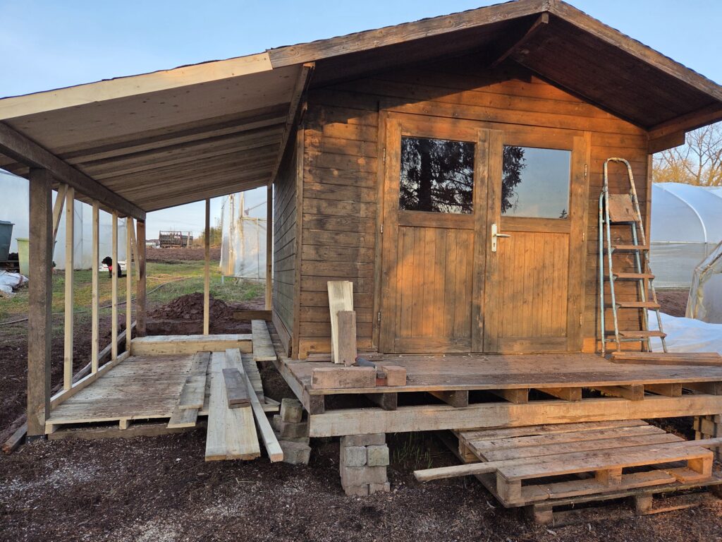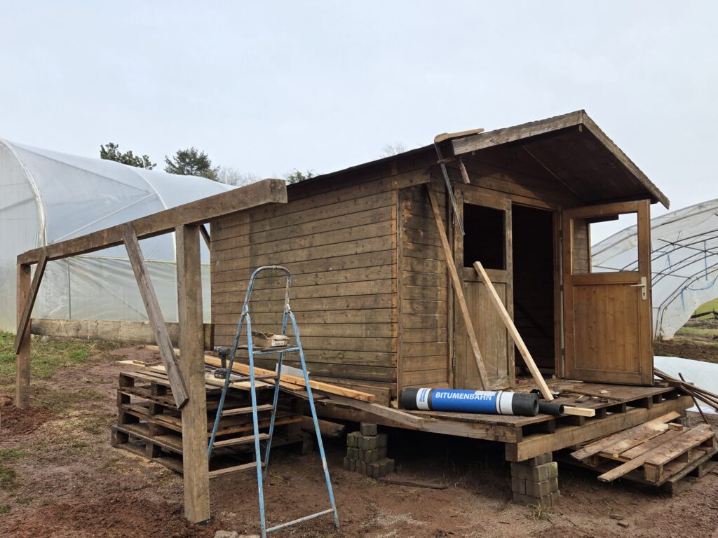 Nun fehlen nur noch die Wände um den Geräteschuppen und das Blech fürs Dach. Die Hütte soll zukünftig uns und unsere Mitarbeitern sowie Mitmachenden als Aufenthalts und Aufwärmmöglichkeit zur Verfügung stehen.