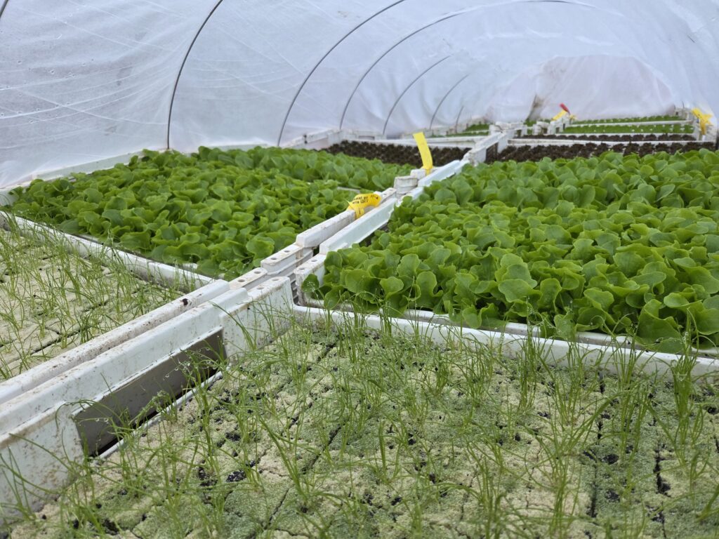 Bereits leergeräumte Beete wurden vorbereitet und Asiasalat eingepflanzt. Weitere Kisten mit Asia-, Schnitt-, Kopf-,und Krulsalate sowie Frühlingszwiebeln warten drauf ebenfalls eingepflanzt zu werden.