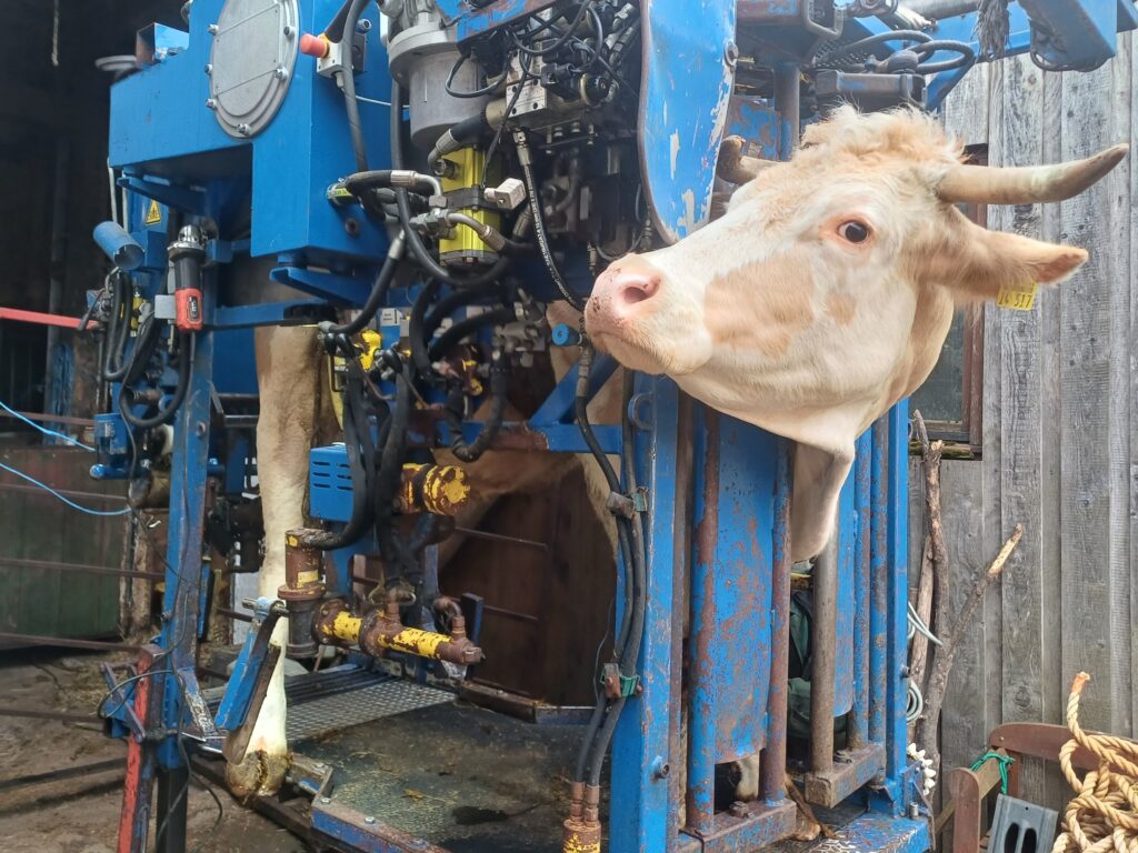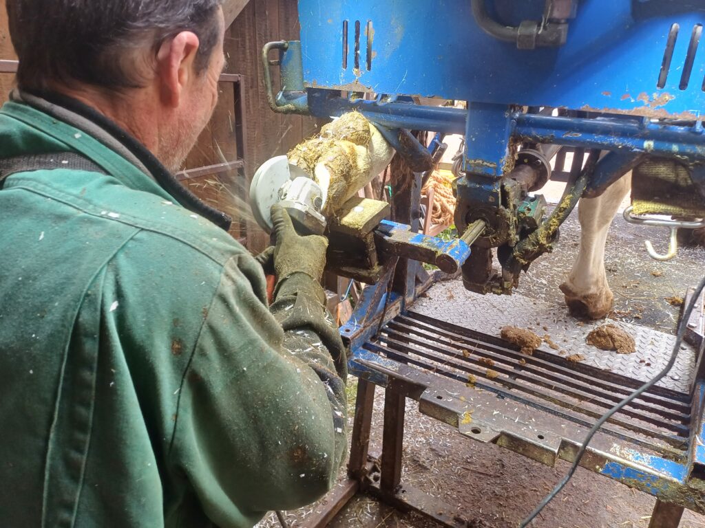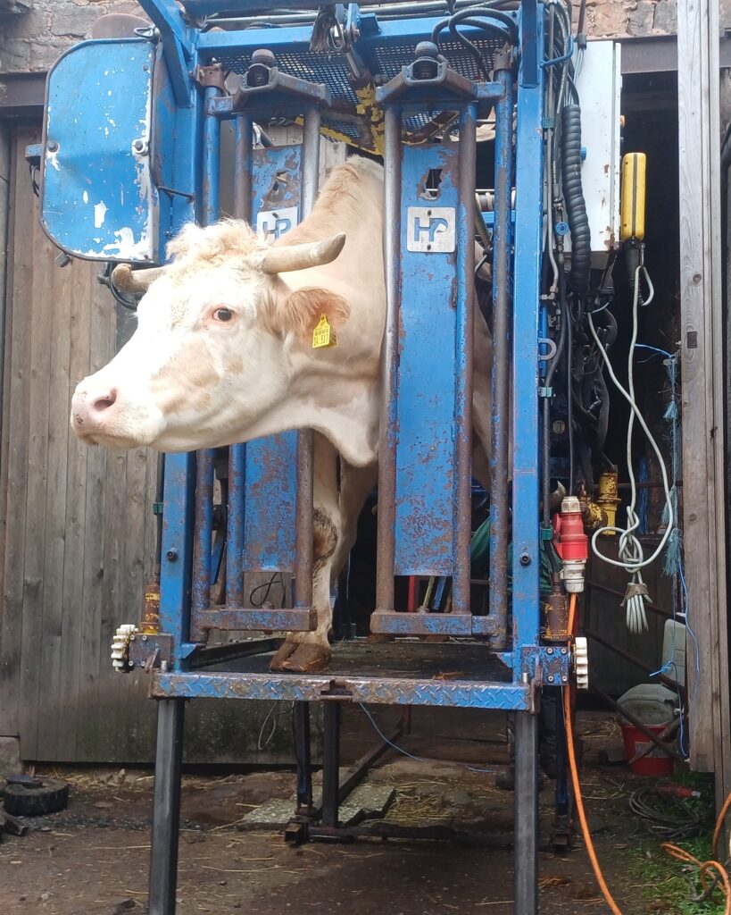 Im Klauenstand: Kuh Mia staunte mal nicht schlecht als der Klauenpfleger mit diesem hochtechnischen Gerät vor fuhr und sie dann auch noch dort hinein musste.