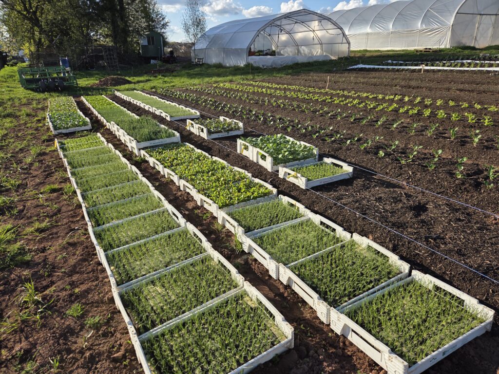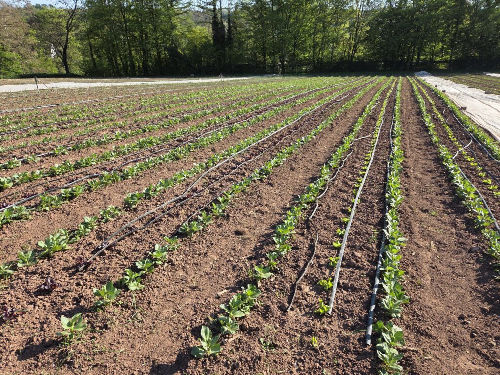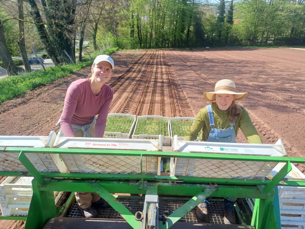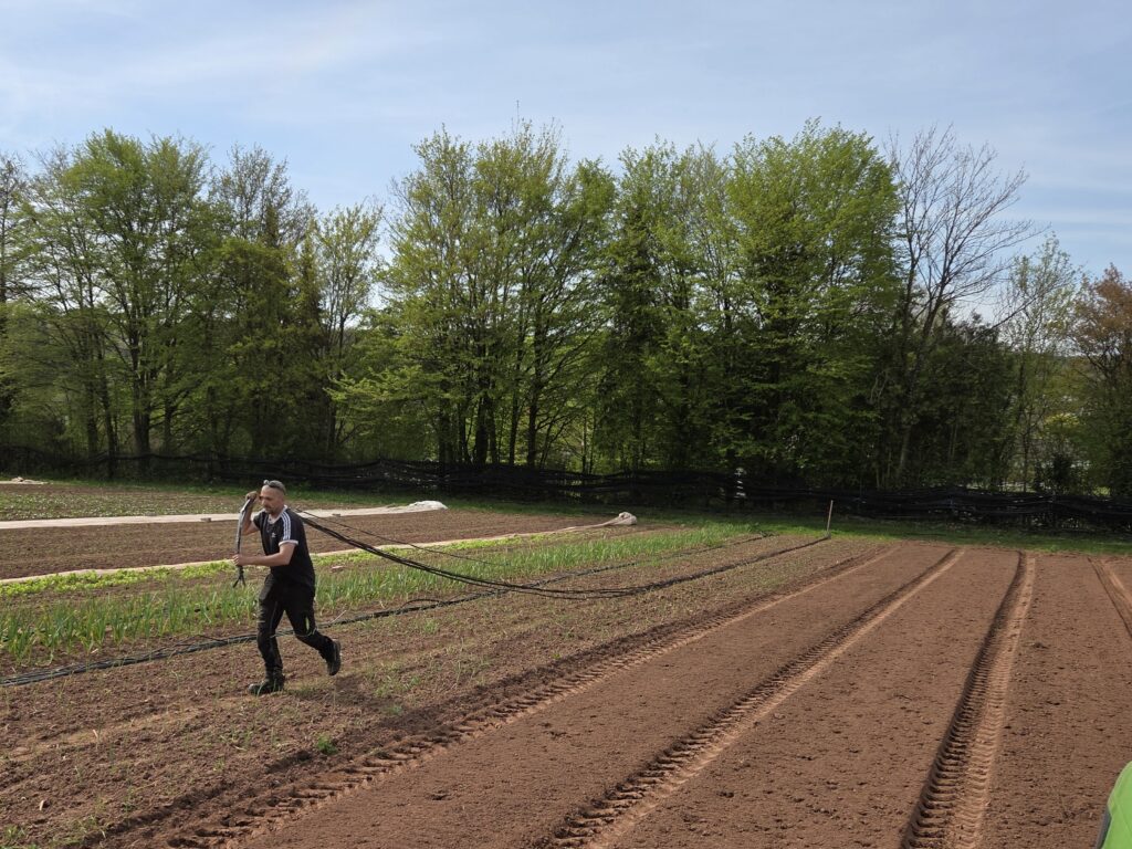Außerdem hat Michael bei unserer Bänderpflanzmaschine ein viertes Pflanzschar montiert, welches noch vorhanden war, jedoch haben wir bisher die meisten Kulturen dreireihig ins Beet gepflanzt. Dies wollen wir zukünftig ändern um auf weniger Fläche dennoch ausreichend Erträge zu erzielen (ähnlich wie beim Market Garden Anbausystem). Andy zog derweil Tropfschläuche in die Wege um anschließend direkt die Jungpflanzen mit Wasser zu versorgen, die Schläuche haben meist nach der Winterpause Löcher die nacheinander geflickt werden müssen.