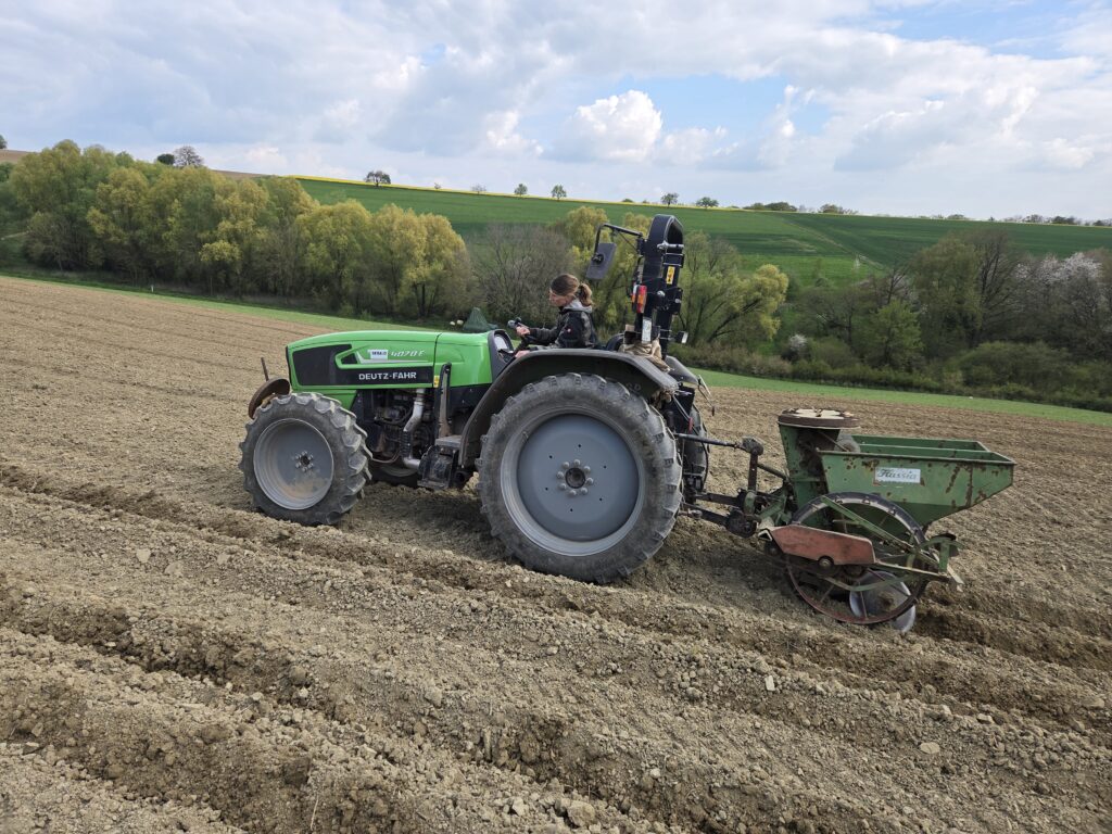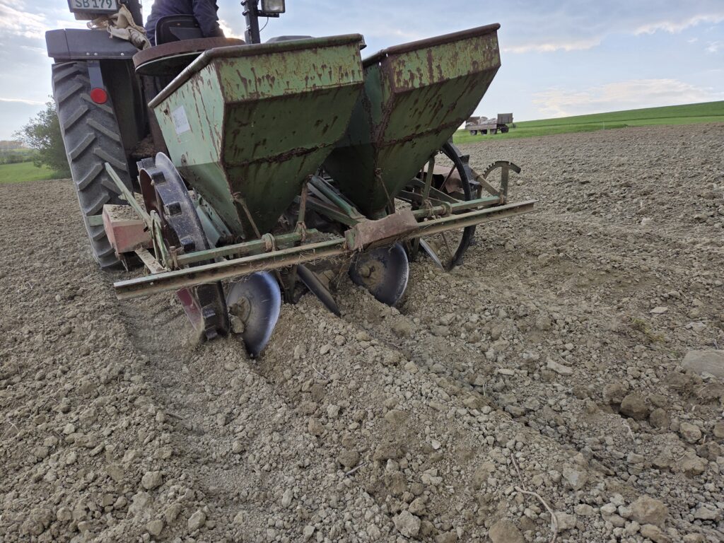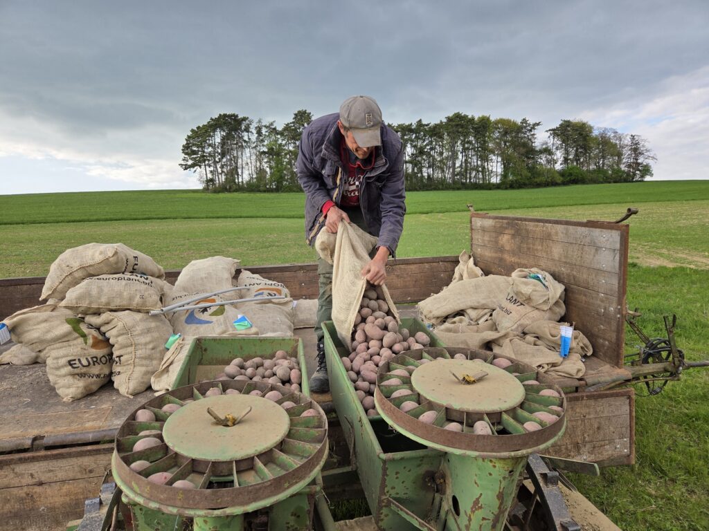 Die Neuen Pflanzkartoffeln wurden bereits Ende März geliefert letzten Dienstag haben wir sie in den Boden gelegt. Insgesamt sieben verschiedene von frühen, mehlig, fest und überwiegend festkochenden Sorten. Die ersten Frühkartoffeln können wir voraussichtlich im Juli ernten, bis dahin müsst ihr euch noch etwas gedulden, zurzeit gibt es ja aber noch welche aus unserem Vorratskeller, der nach der Ernte vom letzten Jahr gut gefüllt war 🙂